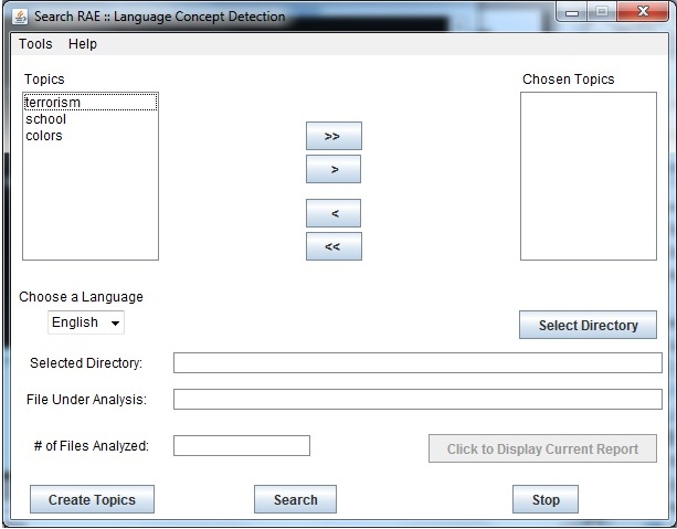 | Search RAE can scan computer directories and files for topics of interest to the user. Several topics (terrorism, school, etc.) have been created and are shown below. Users can create any topic they want by pressing the "Create Topics" button. To use Search RAE, a user chooses one or more topics, selects a directory to scan (all subdirectories are also scanned), chooses a language, and presses "Search". All text files (with extensions .TXT, .RTF, or .DOC) are searched. Microsoft Outlook and Eudora email folders, if under the selected directory, are also scanned. |